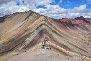 The Mountain of the Seven Colors, also known as the Vinicunca or Rainbow Mountain, is a mountain formation located in the region of Cusco, Peru, characterized by stripes of intense shades of fuchsia, turquoise and other colors.